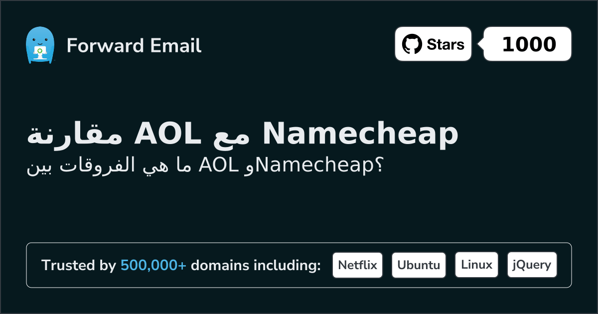 AOL"AOL Mail هي خدمة بريد إلكتروني مجانية تعتمد على الويب تقدمها AOL، وهي قسم من Yahoo! Inc." | مقابل | Namecheap"احصل على المزيد من خلال البريد الإلكتروني الاحترافي بتكلفة أقل" |