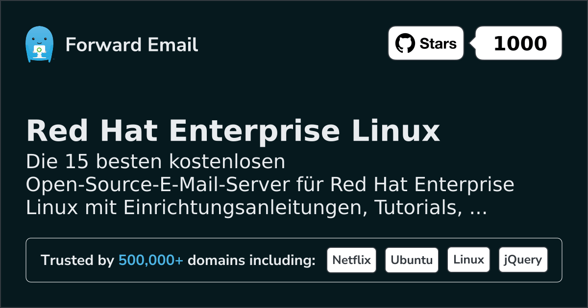 Forward Email ist eine Open-Source-E-Mail Server für Red Hat Enterprise Linux. Die offizielle Beschreibung auf der Website lautet: „Datenschutzorientierte, verschlüsselte E-Mails für Sie. Wir sind der bevorzugte E-Mail-Dienst für Hunderttausende von Kreativen, Entwicklern und Unternehmen. Senden und empfangen Sie E-Mails als Sie@IhreDomain.com mit Ihrer benutzerdefinierten Domain oder verwenden Sie eine unserer Domains.“