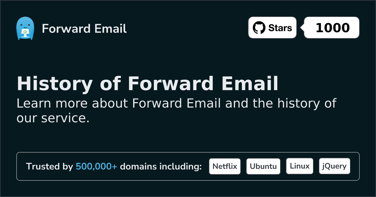 November 2017: Forward Email officially launched after an initial release. The early version was purely DNS-based with no account registration or sign-up process—simply a README file written in Markdown with instructions. Users could set up email forwarding by configuring MX records to point to mx1.forwardemail.net and mx2.forwardemail.net, and adding a TXT record with forward-email=user@gmail.com.
