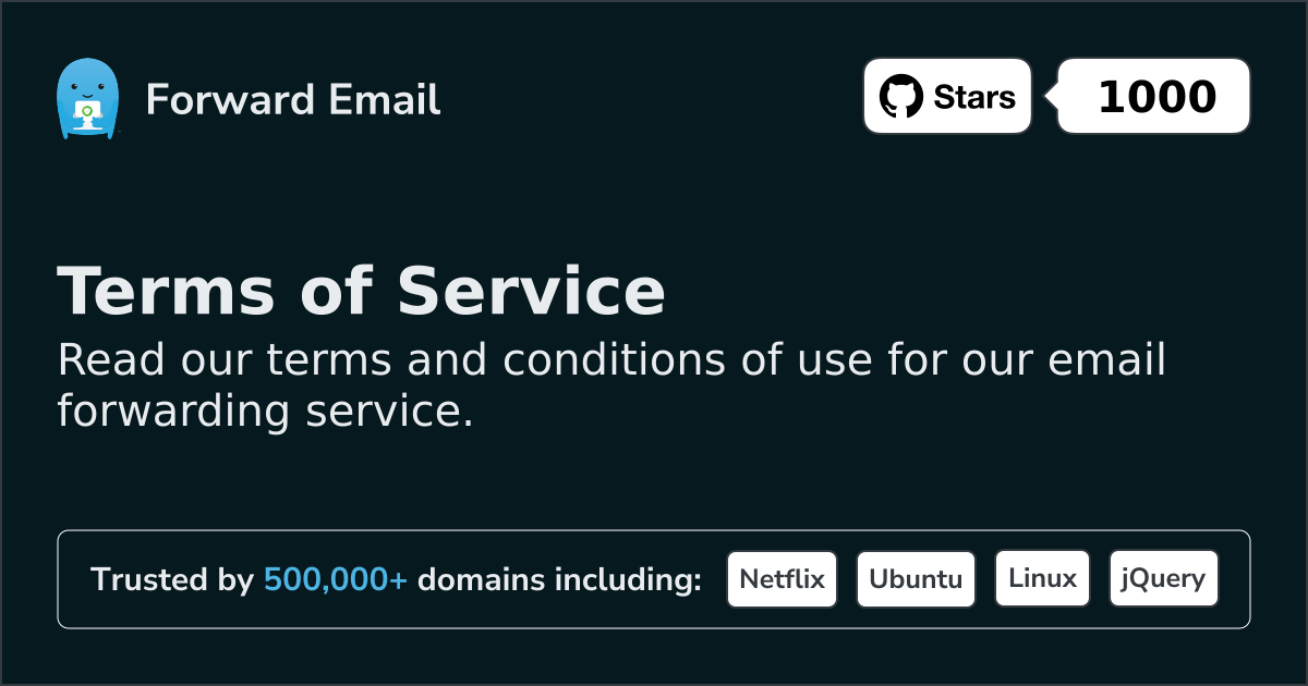 Forward Email may revise these terms of use for its web site at any time without notice. By using this web site you are agreeing to be bound by the then current version of these Terms and Conditions of Use.