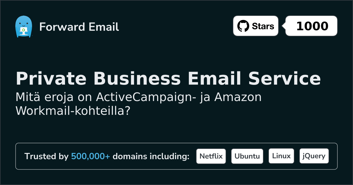 ActiveCampaign"Postmark, johtava transaktiosähköpostipalvelu, on nyt osa ActiveCampaignia" | vs. | Amazon Workmail"Amazon WorkMail on turvallinen ja hallittu yrityssähköposti- ja kalenteripalvelu, joka tukee olemassa olevia työpöytä- ja mobiilisähköpostisovelluksia." |