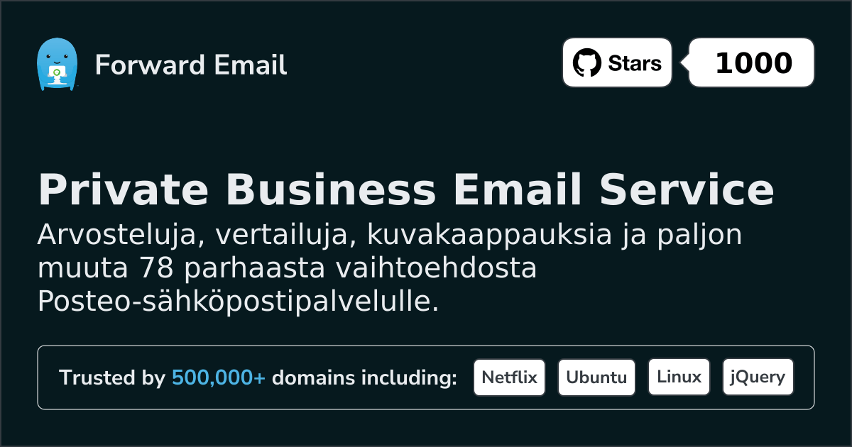 Forward Email⭐ EhdotettuSähköposti kaikille | $3/mo | 10 GB pooled | 50 MB | Kyllä | Kyllä | Kyllä | Kyllä | TTI | Kyllä | Kyllä | Kyllä | Kyllä | ⚠️ Opt-in | Kyllä | Kyllä |