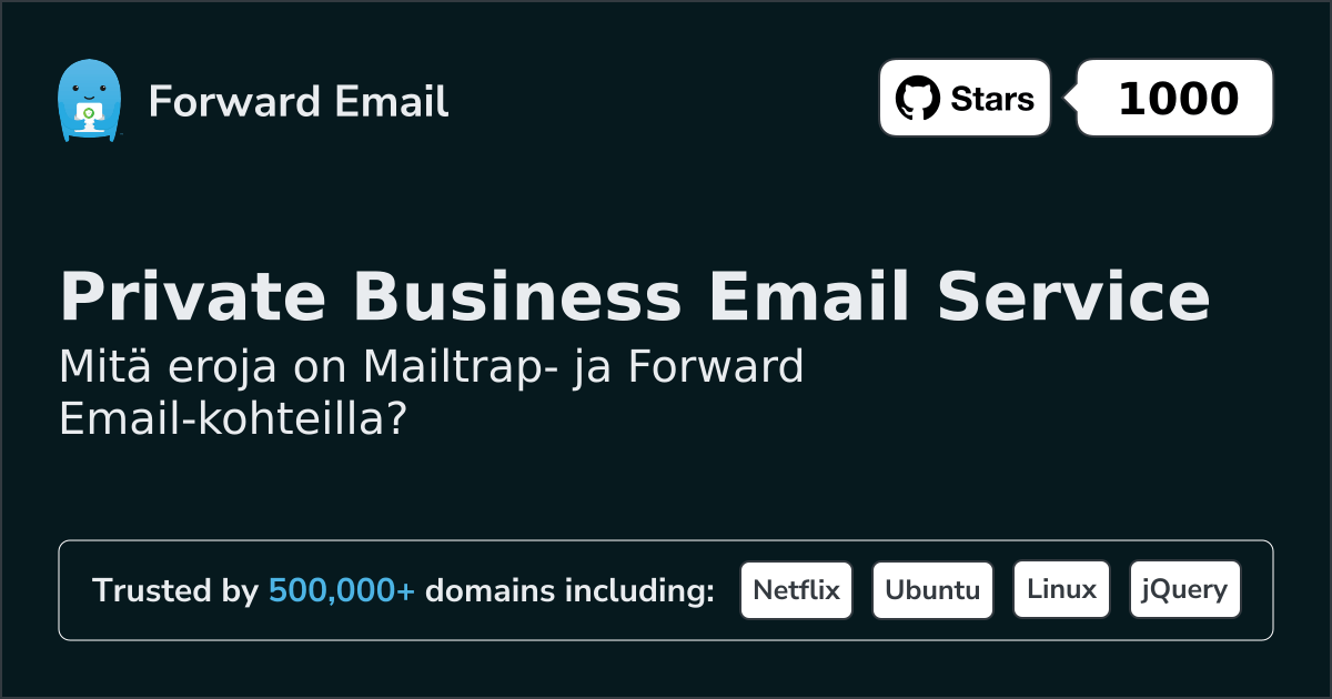 Mailtrap"Sähköpostien toimitusalusta, joka toimittaa sähköpostit juuri oikeaan aikaan. Loistava sekä yrityksille että yksityishenkilöille." | vs. | Forward Email⭐ Ensisijainen "Sähköposti kaikille" |