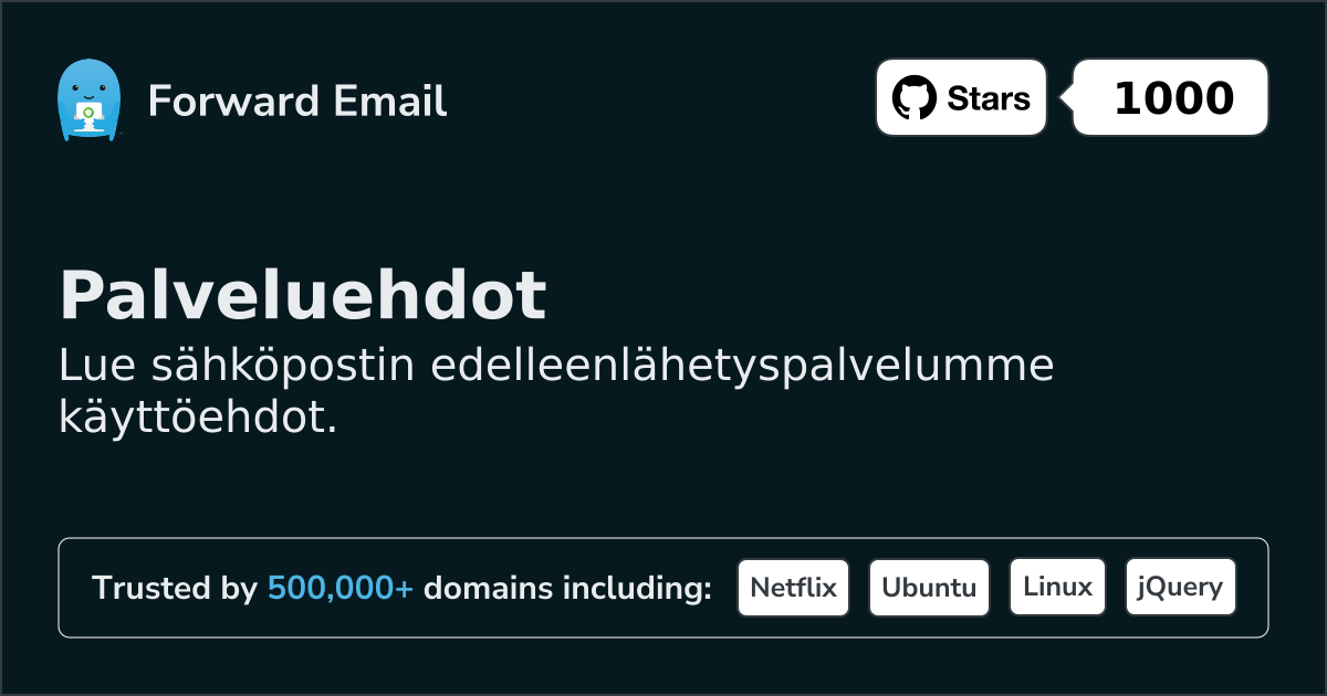 Forward Email voi muuttaa näitä verkkosivustonsa käyttöehtoja milloin tahansa ilman erillistä ilmoitusta. Käyttämällä tätä verkkosivustoa hyväksyt näiden käyttöehtojen kulloinkin voimassa olevan version.