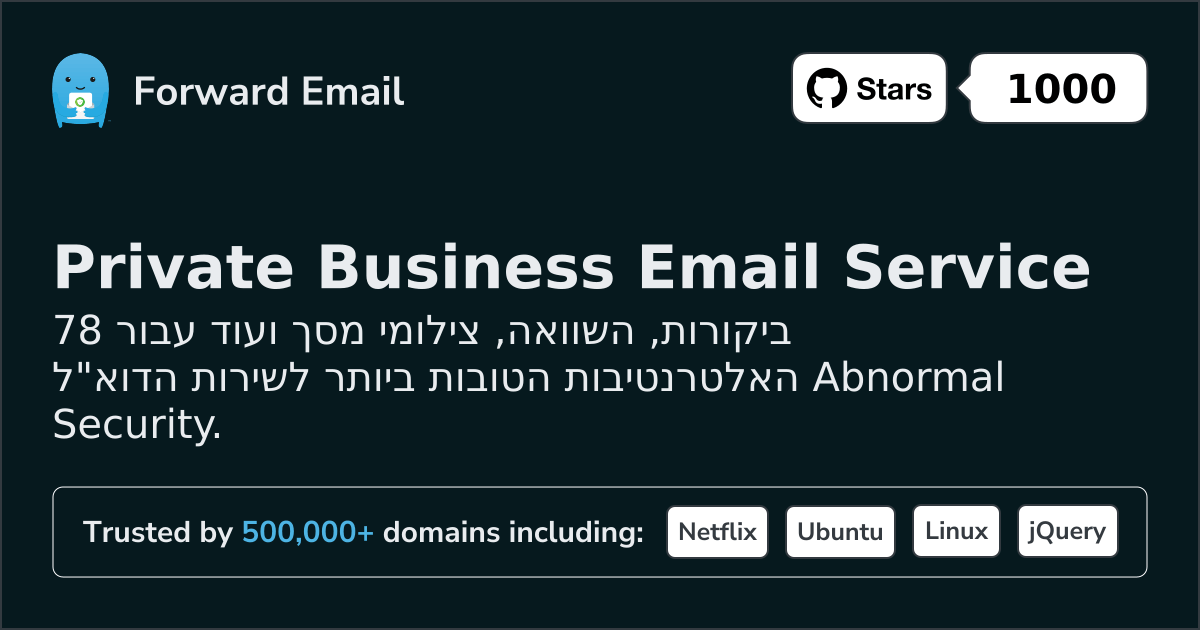 Forward Email⭐ מוּמלָץאימייל לכולם | $3/mo | 10 GB pooled | 50 MB | כֵּן | כֵּן | כֵּן | כֵּן | TTI | כֵּן | כֵּן | כֵּן | כֵּן | ⚠️ Opt-in | כֵּן | כֵּן |