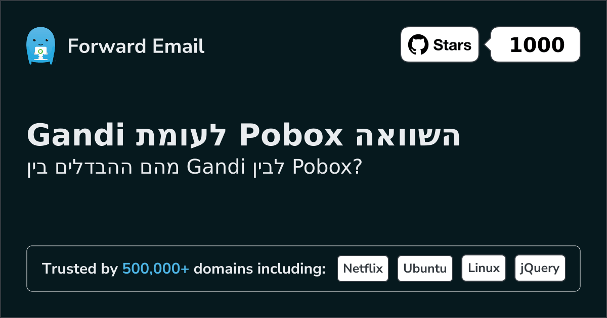 Gandi"אנו מנהלים מעל 780,000 כתובות דוא"ל בשרתי הדוא"ל שלנו, למה לא שלכם?" | לעומת | Pobox"בטל את ביטול זהות הדוא"ל שלך" |
