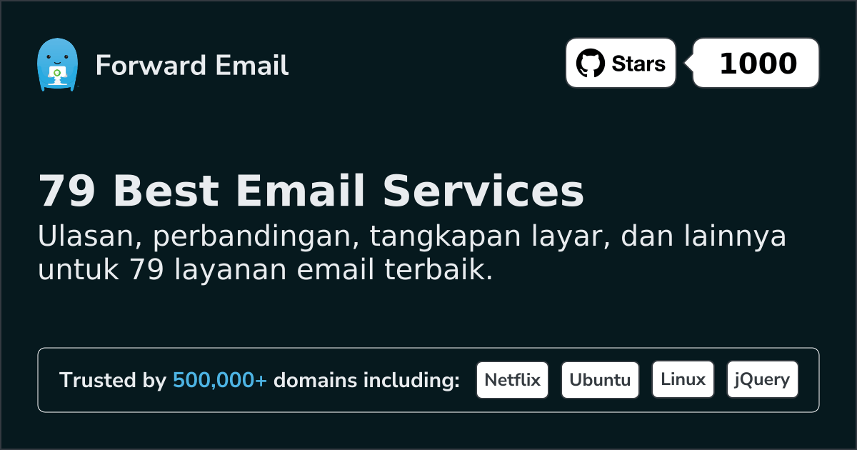 Forward Email⭐ DirekomendasikanEmail untuk semua orang | $3/mo | 10 GB pooled | 50 MB | Ya | Ya | Ya | Ya | TTI | Ya | Ya | Ya | Ya | ⚠️ Opt-in | Ya | Ya |