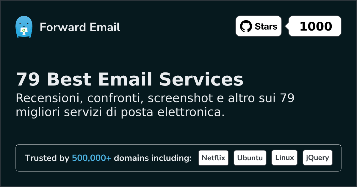 Forward Email⭐ I più votatiEmail per tutti | $3/mo | 10 GB pooled | 50 MB | SÌ | SÌ | SÌ | SÌ | TTI | SÌ | SÌ | SÌ | SÌ | ⚠️ Opt-in | SÌ | SÌ |