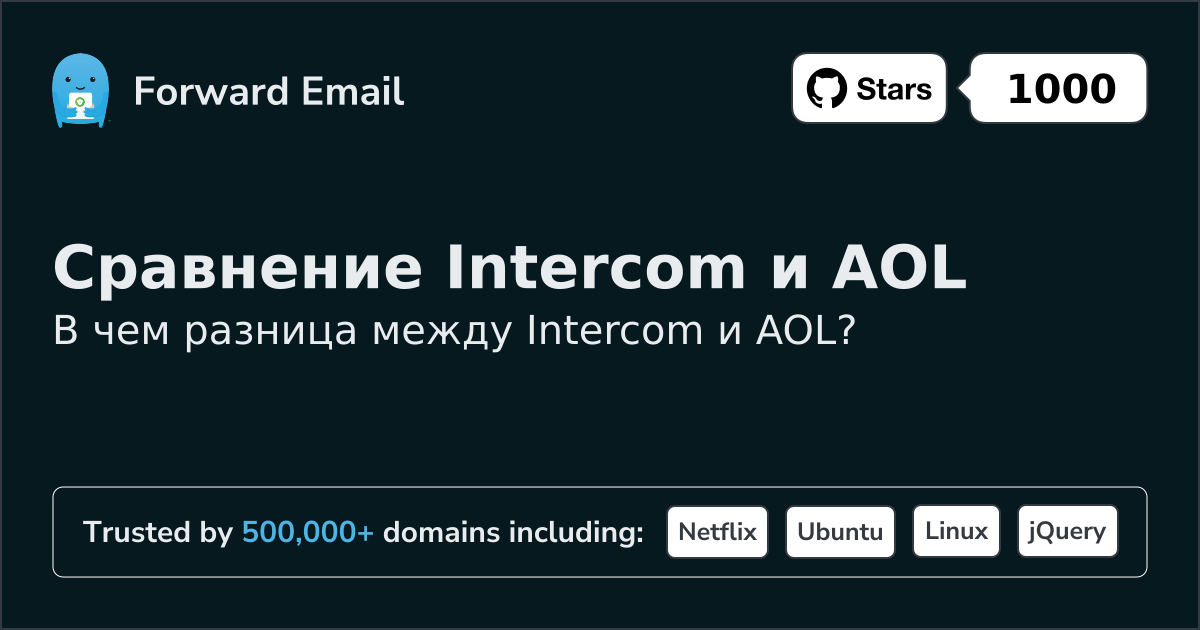 Intercom"Единственное решение для обслуживания клиентов на базе искусственного интеллекта, которое вам нужно" | против. | AOL"AOL Mail — бесплатная веб-служба электронной почты, предоставляемая AOL, подразделением Yahoo! Inc." |
