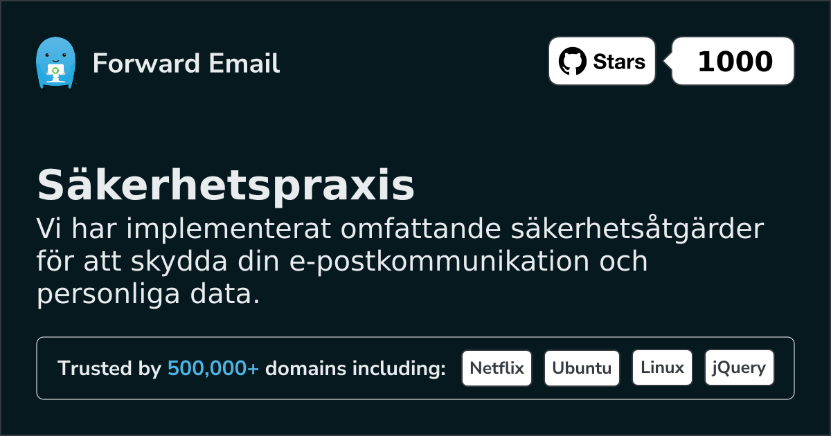 På Forward Email är säkerhet vår högsta prioritet. Vi har implementerat omfattande säkerhetsåtgärder för att skydda din e-postkommunikation och dina personuppgifter. Detta dokument beskriver våra säkerhetsrutiner och de åtgärder vi vidtar för att säkerställa konfidentialitet, integritet och tillgänglighet för din e-post.