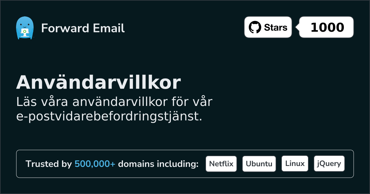 Forward Email har inte granskat alla webbplatser som är länkade till dess tjänst och ansvarar inte för innehållet på sådana länkade webbplatser. Inkluderingen av en länk innebär inte att Forward Email godkänner webbplatsen. Användning av sådana länkade webbplatser sker på användarens egen risk.