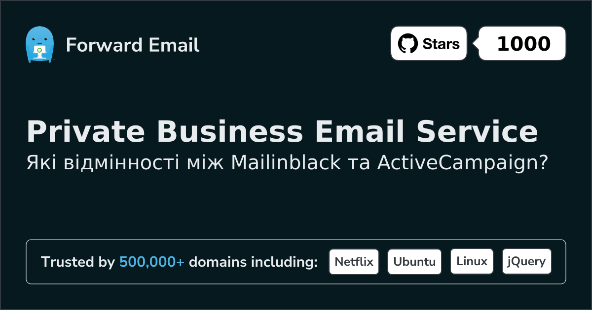 Mailinblack"Ваша кібербезпека – наша робота" | проти | ActiveCampaign"Postmark, провідний сервіс для транзакційної електронної пошти, тепер є частиною ActiveCampaign." |