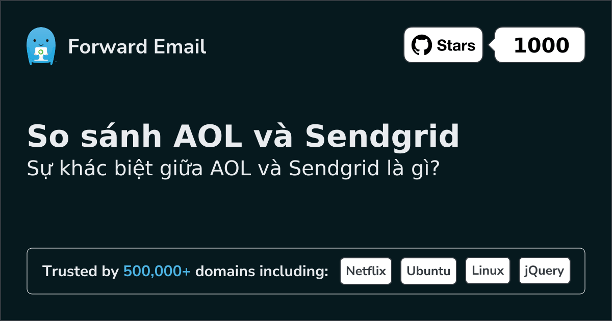 AOL"AOL Mail là dịch vụ email miễn phí trên web do AOL, một bộ phận của Yahoo! Inc. cung cấp." | so với | Sendgrid"Đưa email của bạn vào hộp thư đến—nơi chúng thuộc về" |