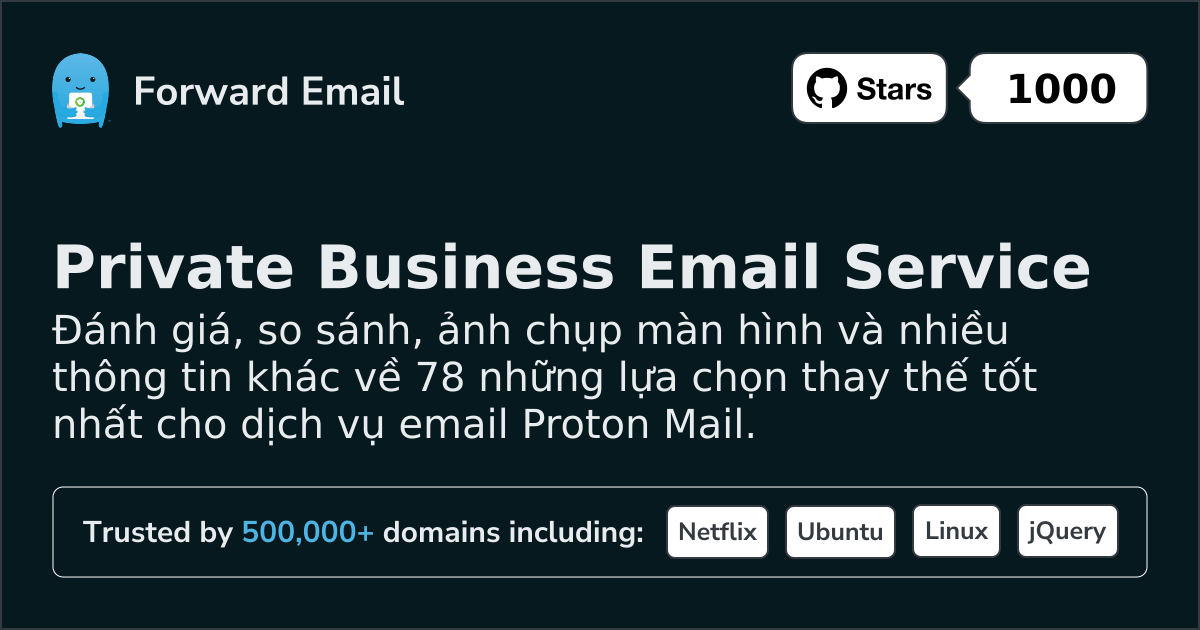 Forward Email⭐ Đề xuấtEmail cho mọi người | $3/mo | 10 GB pooled | 50 MB | Đúng | Đúng | Đúng | Đúng | TTI | Đúng | Đúng | Đúng | Đúng | ⚠️ Opt-in | Đúng | Đúng |